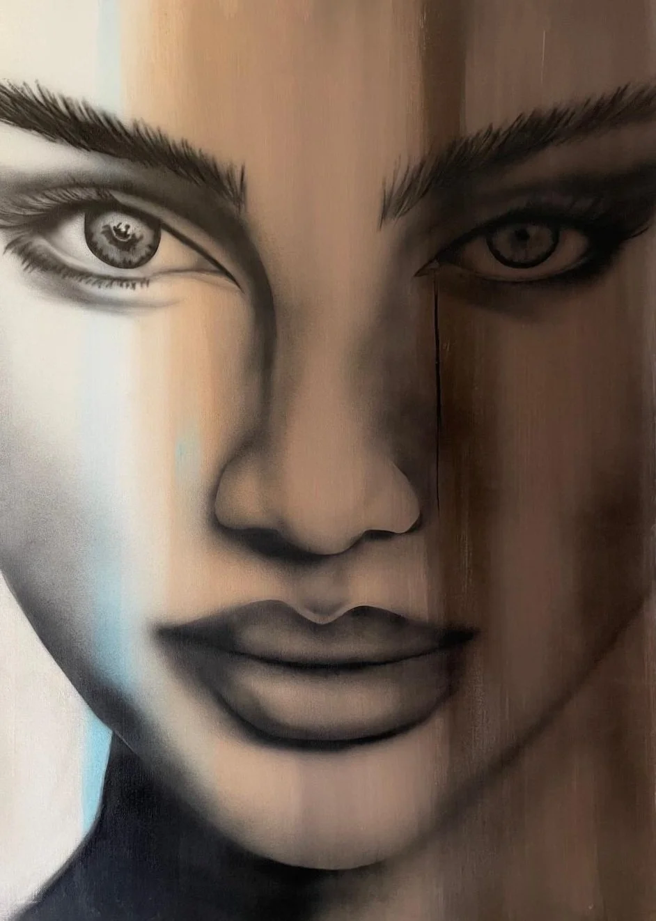 Quest’opera presenta un ritratto di una donna il cui volto occupa l’intera tela, diviso tra luce e ombra. La metà immersa nell’ombra conferisce un’aura di mistero e introspezione, mentre la metà illuminata, rivela dettagli vividi e accattivanti. Gli occhi della donna sono penetranti e magnetici, fissano l’osservatore con un’intensità che sembra scrutare l’anima. Le labbra accennano a un leggero sorriso, un’espressione ambigua che può essere interpretata come un segno di serenità o di enigma. E’ una riflessione sulla dualità intrinseca della condizione umana. Il contrasto tra le due metà del volto rappresenta il conflitto tra le forze opposte che convivono in ognuno di noi: la luce e l’oscurità, la gioia e la tristezza, la serenità e l’inquietudine. Gli occhi penetranti della donna, che sembrano seguire l’osservatore, suggeriscono una profondità di pensiero e di emozione, mentre il sorriso appena accennato lascia spazio all’interpretazione personale, stimolando una connessione emotiva con l’opera.
