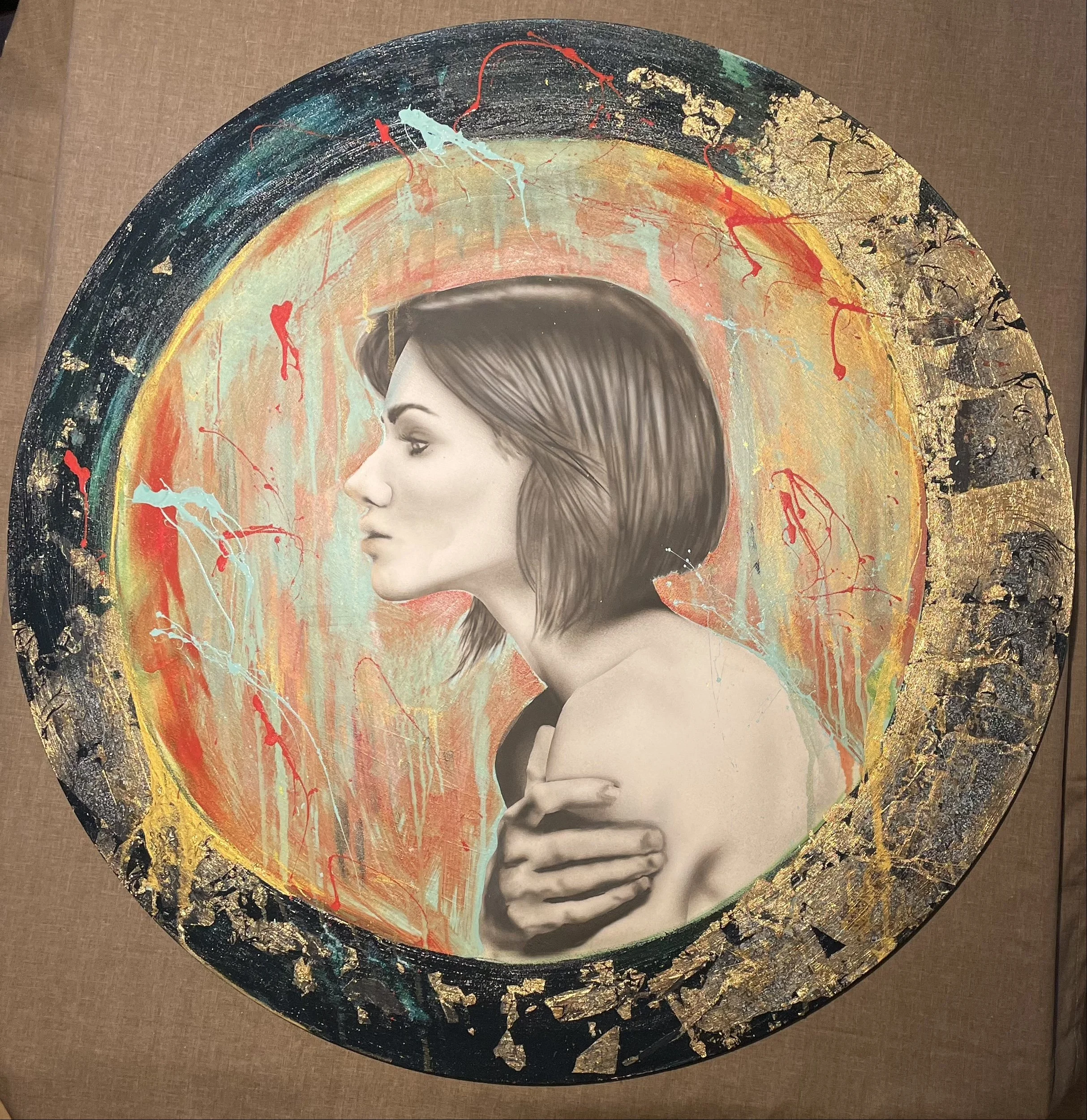 Il quadro rotondo ritrae una donna di profilo, avvolta in un momento di intimità e vulnerabilità, mentre si stringe le spalle in un gesto di protezione o rassicurazione. Il suo profilo delineato con delicatezza cattura l'attenzione dello spettatore, mentre lo sfondo, dipinto con tinte colorate e spruzzi di colore, aggiunge un tocco di vitalità e dinamismo alla scena. La cornice rotonda, adornata con foglie d'oro, sembra quasi evocare uno spicchio di luna, conferendo al quadro un'atmosfera magica e misteriosa. Complessivamente, il dipinto trasmette una sensazione di intimità e connessione con la natura, invitando lo spettatore a riflettere sulla fragilità e sulla bellezza dell'essere umano.